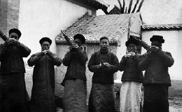 图七,是胶东某地的一个民间乐班。这张照片与一些记录红白喜事的照片贴在一起,想来是传教士在拍摄某次红白喜事时,随手拍摄了这张乐班的“全家福”。过去,凡日子过得像样点的,遇有红白喜事,吹吹打打的乐班总是要请的。从照片背景看,这家主人的屋宇堪称轩昂,当是一户家境殷实的人家。这种民间乐班,通常都是业余的,其中有个班主,有生意了,便临时把大家召集到一起,完事之后,各自散去。有些“做功”比较地道的乐班,在十里八乡,经过口口相传,便有了些名气,逐渐变成“职业吹打”的乐班亦有之。另有一些走村串乡的戏班,有时也兼做“吹吹打打”的营生,顺便挣点散碎银子。