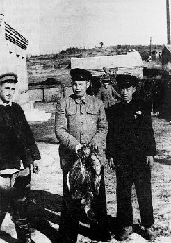 图一 1950年代初,李功(右)陪同斯柳萨列夫军长到野外打猎归来后所拍摄。中间手持猎物的是军长的副官雅沙,站在左边的是军长的司机。