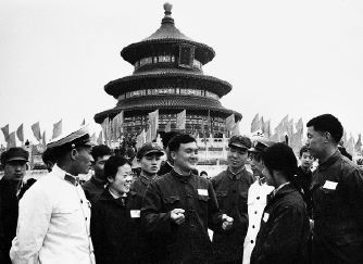 现在,我们来看看下面这张照片。图五的原说明文是:“在粉碎‘反革命逆流’的斗争中建立功勋的首都工人民兵、人民警察和警卫战士参加游园。他们表示要更紧密地团结战斗,把反击右倾翻案风斗争推向新高潮,为反修防修,巩固无产阶级专政努力作战。”所谓“粉碎反革命逆流的斗争”,指的就是平息“四五”事件。照片里的人物到底在斗争中建立了什么样的功勋,说明文里未说,恐怕不外乎是他们的棍棒上多沾了一些鲜血,或者是他们从广场上比别人多抓了几个“反革命暴徒”……不过想想,他们也怪可怜的,他们是共和国历史上“最短命的英雄模范”,仅仅过了一年多,平息“四五”事件的“功绩”,便被永远地钉在了历史的耻辱柱上。