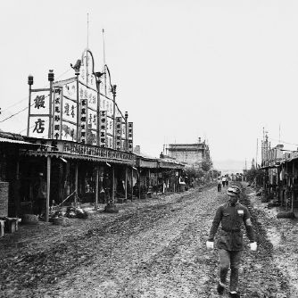 孙明经摄影作品:走在绥远集宁街道上的军人,此时汤恩伯的十三军正驻防这里。