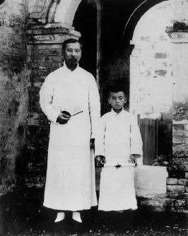 1918年,初小毕业的孙明经手执毕业证书与父亲合影。