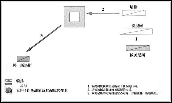 ◎ 伽比埃奈会战的尾声。在伽比埃奈会战以及更早的拉米亚会战、赫勒斯滂会战中,高素质的方阵部队都在遭受骑兵侧后威胁的情况下结阵退出了战场,这一情况体现了大部分无马镫骑兵对重步兵的无可奈何。