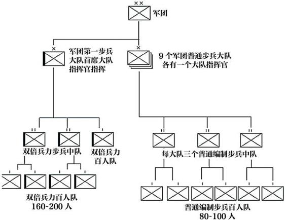 ◎ 马略时期军团指挥结构图。步兵大队这一单位从第二次布匿战争时期出现后,其重要性逐渐提升,并在共和国晚期成为军团最重要的中层战术单位。