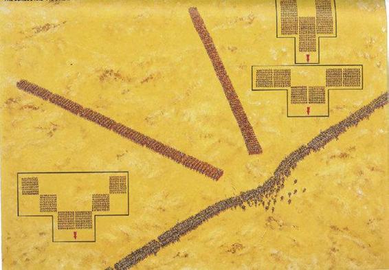 ◎ “猪头”楔形阵。基于纵队战术基础上的楔形阵,结合了萨莫奈步兵战术的相关成果。