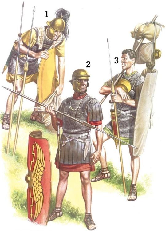 ◎ 共和国晚期和屋大维统治期间的军团形象。1为共和国晚期的军团士兵,23为奥古斯都时代晚期至提比略时期的军团士兵。