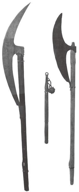 长柄刀、长戟和长柄斧均为欧洲的舶来品。长柄刀的外形类似于中国的青龙偃月刀:单刃刀身连接着一根长形木柄。一般而言,形状像斧头的刀身长18英寸(45厘米)左右,被固定在木柄(通常长2米左右)上。少数长柄刀的刀身背面是钩子状的,专门用于对付骑兵,这种长柄刀被称为“钩镰刀”。长柄刀可以兼作一支铁头木棒、一支短矛、一支斧形枪,或一支长戟,英国人西维尔认为它是长兵器中的王者。