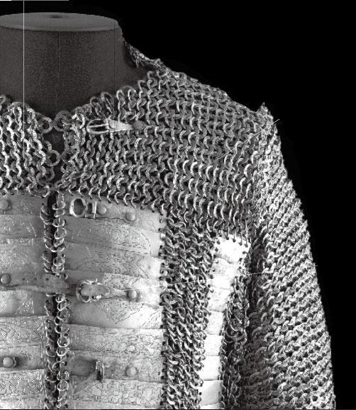 铠甲叫“泽拉·古雷克”,起源于15世纪,这件短袖身甲能将整个上半身身躯除胳膊外的主干部分完全覆盖,铠甲上端带有护颈,下端则是长长的、一直下垂到小腿上的甲裙。附有一条长及膝盖并带有护膝的甲裤。身甲为锁子甲式,前胸和甲裤大腿部分有铁叶甲片加固,甲片用铆钉和皮带固定在身甲上,表面绣有叶片图案和宗教铭文。