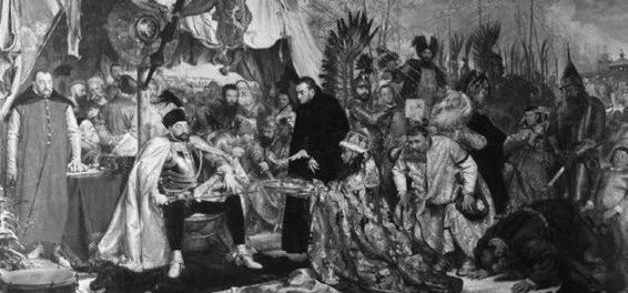 ◎ 斯特凡·巴托雷在普斯科夫(扬·马泰伊科作,坐着的人为巴托雷,左一为扎莫伊斯基)。