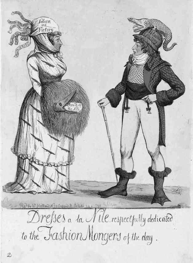 纳尔逊在尼罗河的胜利被以不同的方式庆祝着,人民急切地找寻任何可以媲美这一场胜利的东西:战争胜利的消息刚传到伦敦,就有人绘制了这幅《盛装尼罗河》(DressàlaNile),图中满是对埃及服饰的荒诞想象。(国家海事博物馆,PW3864)