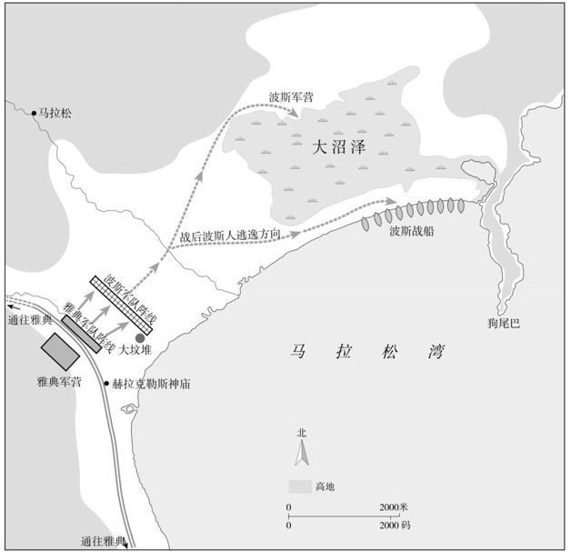 关于这次进军的不寻常的故事,稍后再讲。有人说雅典人跑步前进一英里,这好像意味着第一次敢于进攻波斯人的这些勇士都超出常人。实际上,没有人能够穿戴着全副甲胄跑上一英里远,然后还有力气继续作战,因为这套武装用青铜、木材和皮革制成,总重量达到70磅。即便在凉爽的清晨,汗水也会很快混合着被千万只脚踏起的尘土,让前进中的重甲步兵由于眨眼而感觉刺痛,渐渐失去视力,他们面前的敌人的各种形象——身穿奇装异服、正在弯弓射箭的弓箭手、正在瞄准的投石手、波斯队伍中开心而疑惑的表情——都会在眼前变得越来越模糊。不久,当雅典人进入无人纵深的地带时,第一批箭镞呼啸着向他们飞来,他们立即举起沉重的盾牌保护自己的胸膛,重甲步兵终于开始冲锋了。与此同时,方阵就像一头“被逼到角落中的野兽,面向对手鬃毛倒竖”49,前三排战士俯下身体将长矛瞄准,准备迎接即将到来的攻击。还有150码的距离,这时一阵箭镞和飞石突然袭来,倾泻如雨,击中他们的盾牌,乒乓作响,打中他们的头盔后高高弹起,击中落后的重甲步兵的大腿或者咽喉;希腊人顶住狂暴的袭击加快冲锋的脚步。这时在他们面前的敌军已经开始乱作一团,纷纷竖起屏障,因为他们意识到,这面由盾牌和铁尖长矛组成的墙壁,对他们的箭手来说是难以对付的,就在他们想到这些的时候,冲锋完全没有停下来。100码、50码、20码、10码……突然,雅典人发出了可怕的吼叫声,声音甚至压过扬起地面尘土的雷霆般的脚步声,一阵刺耳的金属撞击声之后,被击中的敌人发出痛苦的呻吟,方阵冲破了波斯人的阵线。