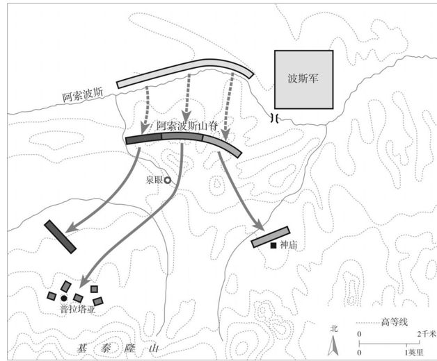 这不是一个小问题。中军的士兵们来自不同的城邦,夜间行军非常困难,他们必须穿过毫不熟悉的地形,结束撤军很快就变成一团乱麻。人人饥渴难耐,心情紧张,不出意料地错过了集结地点,到了偏西一英里的地方,几乎正好位于普拉塔亚废墟之上,他们在此“四散开随意地搭起了帐篷”。54与此同时,两翼的军队出现了更大的混乱。直到天亮的时候,雅典人和另外一侧的拉斯第蒙人与泰格亚人都尚未开始撤退。这三队人马的任务是殿后,最后却发现自己造成了联军部队撤军的混乱和拖沓,整晚仍然滞留在自己的哨位上。现在河边的鸟儿已经开始歌唱,对岸敌人营地中已经人马喧嚣。