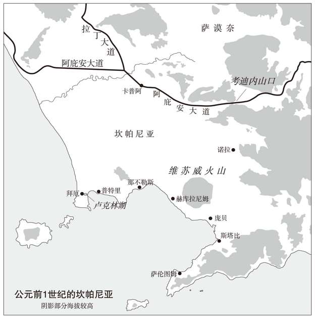 很快,新发明在那不勒斯海湾传播开来,成为财富与时髦的代名词。远一些的内陆地区也一样。在以香水业闻名的古老城市卡普阿(Capua),在罗马超过两个世纪的忠实盟友诺拉(Nola),温水游泳池到处都是,象征着宁静与舒适。城墙外是苹果园、葡萄园、无花果园,以及大片的野花,一直延伸到维苏威火山和海边。这便是意大利的明珠坎帕尼亚(Campania),富人的游乐场,富饶、兴旺且奢华。