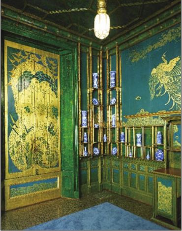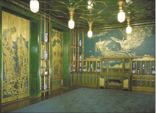 蓝色与金色交相辉映的孔雀屋,其中陈列着青花瓷,创作于1876年至1877年。查尔斯·朗·弗利尔捐赠,华盛顿弗利尔美术馆收藏。