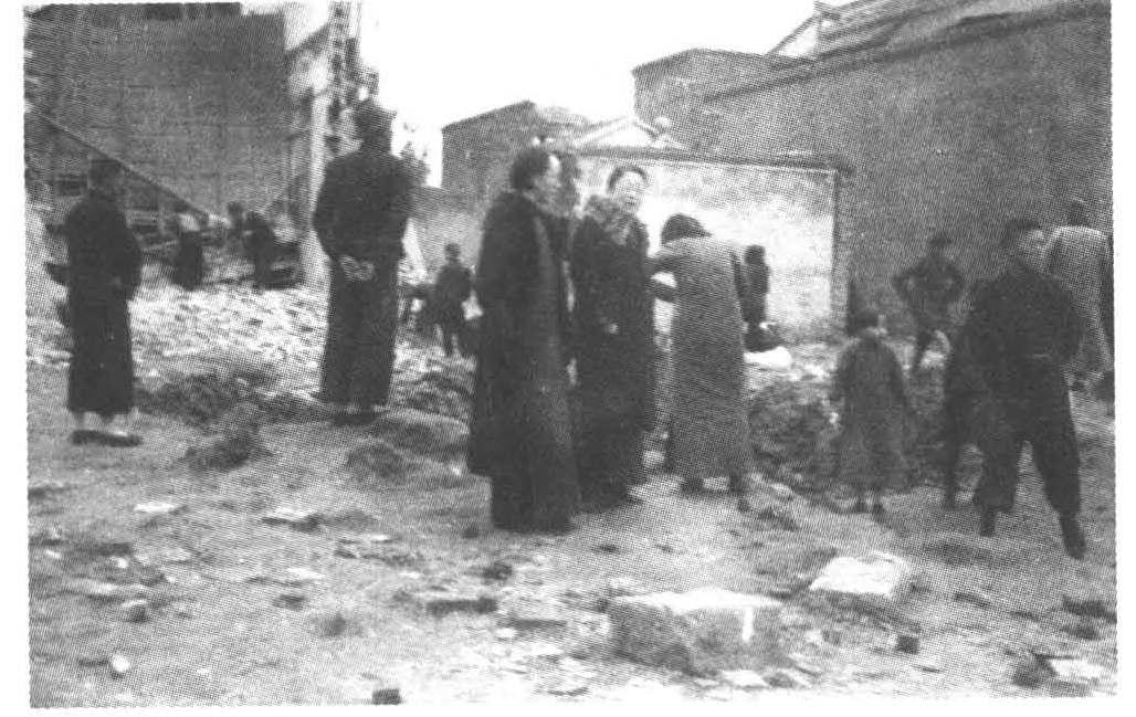 当我们向联大的防空洞跑去的时候,另一架轰炸机正在下降。我们停止奔跑,心想这次跑不掉了,倒不如大家要死死在一起,省得孤零零地活着受罪。这最后的一颗炸弹没有爆炸,而是落在我们在跑着的那条街的尽头。我们的东西(现在已经很少了)都从玻璃垃圾堆里掘出来了,现在我们就在这儿那儿的朋友家暂住。4