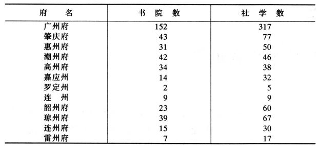在明代,只有生员才能进书院和国学读书。1375年,皇帝曾要求为那些无功名的人创办“社学”。15世纪,这类社学大量建立。在广东省,书院与社学的数目为1: 11。有些社学由于缺乏地方的支持而垮台,因为在晚明时期,人们普遍轻视社学而重视更有声望的书院。但是,仍有许多社学维持了下来,尤其是在南方。19世纪50年代,顺德县仍有31所始建于明朝的社学。