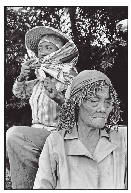 比利良的农作分成两处,一是山上的小米田,一是半山腰的旱稻区。当天的人力分配是一半建屋,一半割稻。原本闲散惯的山胞全变了,灾难没有击倒他们,反而使大家更振作、更团结了。休息时,村民躲到树荫下喝仙草茶,我被这位用叶子覆头的老妇人吸引,觉得她的遮阳装扮仿佛一顶荣耀的桂冠。没错,这次的迁村重建,使很多族人都从常年酗酒的茫醉当中苏醒过来,把时间和体力全用在该用之处。鲁凯人失落已久的荣耀全都回来了,比利良的村民个个都值得尊敬。