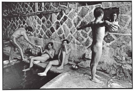 周末假期的大清早,我从温泉路上山,远远就看到磺烟缥缈的溪旁有间石砌的矮房,门外栏杆立着一面告示牌“私人浴池,闲人莫入”。听到淋浴水声和谈笑声,我决定壮胆闯关,心想只要态度坦荡,一定可以让他们了解原委。进门一打照面,四位泡汤客全当场怔住了。我喜气洋洋地道声早,搞不清楚状况的他们脸色才稍微好看一点。没等他们质问,我就先说:“可不可以帮你们拍个照?”语气就像熟识之人,却也谨守分际的礼貌,然后笑开脸等他们回话。他们完全没想到我会以要求当招呼,诧异了几秒之后,靠我最近的一位泡汤客自在又大方地回答:“好啊!”
