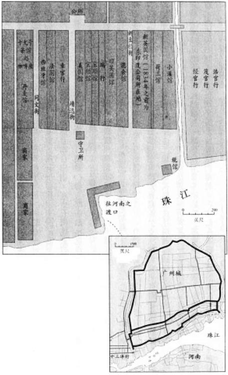 有十三排房舍被称为“行”或“商馆”,这是从一小帮中国商人手里租来,他们得了官府特许,可以同洋人做生意。屋子宽敞,通风良好。其中有好几间毁于1822年的大火,但又用花岗岩和当地的砖瓦石材修葺一新,靠河边一侧修成两层楼,后边则加成三楼。新屋更能防火,附近就有设计巧妙的水龙。十三间房舍各有套间、储藏室、写字间,彼此之间有拱顶过道相连,又保有隐私,长长的走廊和威尼斯式百叶窗挡住夏天烈日。尽管天气炎热,但人在硬藤席或竹席床上睡得很香,一点也不怀念家乡的羽绒被。