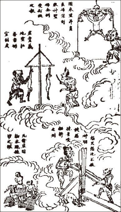《玉历》列举了各类用刑,有闷捂、针刺、刀割火烤、折骨拔牙、毒蛇塞鼻、水蛭吸脑、阉割、碎膝、挖舌、拔指甲、挖眼睛。卞城王所掌六殿中有“十六诛心小地狱”,亦各有其刑罚,上图为其中数种:以钉穿骨、剥皮、锯身、永跪朱砂。