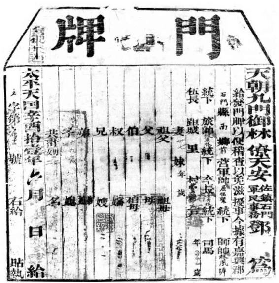 太平天国门牌。太平天国控制一地,便发给所有人家这种门牌,门牌上的资料使得当地的军事指挥官(名字书于门牌右侧)能计算税额,以及可入伍的人数。图中门牌系发给“费鹤云”,四十一岁,家住石门县西乡(在杭州以北八十公里)。费鹤云与妻(三十七岁)、母(六十二岁)、子(十九岁)同住。为了防止擅自篡改资料,另有“共计”一栏,载明费家有二男二女。这枚门牌于太平天国辛酉十一年六月核发(约为公元1861年7月),此时太平天国在沿海地区的势力达于鼎盛。