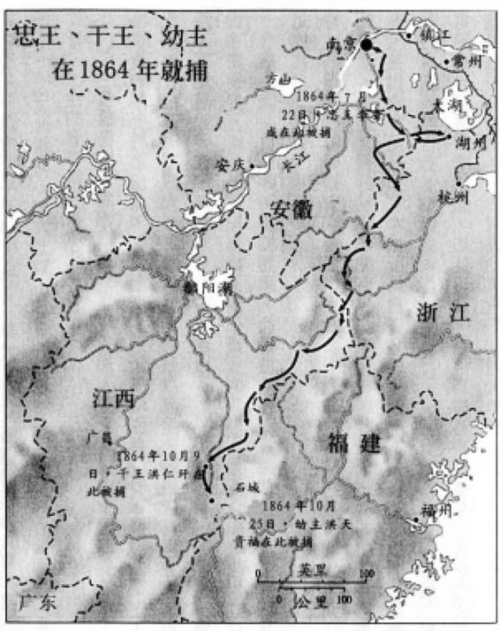 官军、法军、太平天国叛军配备新式武器,且人数日增,力量远远胜过湖州的太平军守军,所以到了1864年8月底,洪仁玕和幼天王便弃城而逃。他们继续南行,似乎想回到太平天国运动发源的广东。他们又在逃亡中苟活了一个月。到了10月,一队官军突袭营寨,洪仁玕与幼天王失散。10月9日,洪仁玕首先被擒42。在受官府审讯的过程中,洪仁玕反复申述他对天王无上权能的确信。他对他们称,洪秀全“长予九龄”,“其天禀圣聪”43。至于紫荆山之崛起,“固由历年神迹所致”;虽然太平天国运动终告失败,但“其享福最久者,首推天王”,因为那些跟他一起在紫荆山首事的同伴皆已过世,唯有他留存于世。11月23日,洪仁玕在江西省会南昌被处决44。