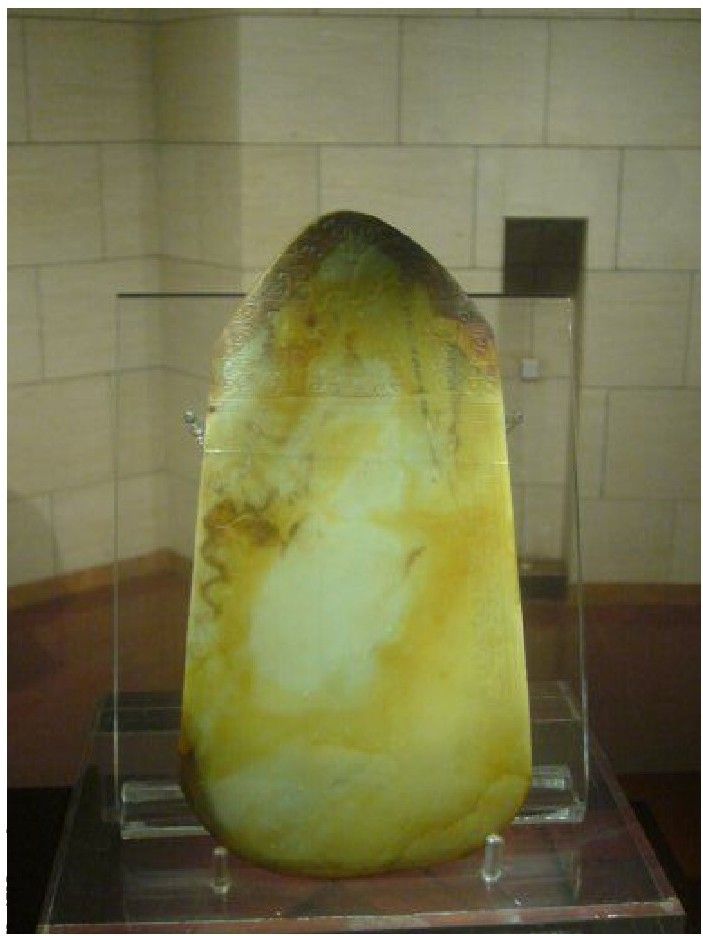 朱章义:这个是我见过的玉钺中最精美的一件,当然是否应当称为钺,我们觉得还有待商榷。它实际上是用一块整玉来做的,上边和下面的玉皮22还在。它上面的兽面纹做得非常精细,两面都有纹饰,而且是对称的。但很奇怪的是,它的下边这部分采取阴刻的手法,而且阴刻的水平相对也比较低。
