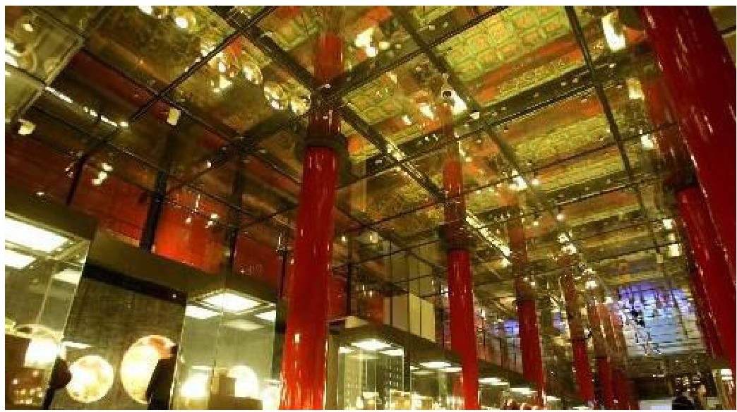 晋宏逵:刚才我讲的第三类展室就是这种展室,这种展室也要突出故宫特色,让展品和它的环境同步,达到一种可以欣赏的程度,并非改造成一个现代化展室就完了。像现在的午门展厅就是这类展厅。在午门展厅,我们离开原来的墙、柱,又专门重新搞了一个稳定的结构,在原来的结构和原来的地面之间都做了充分的隔离。而且我们做了玻璃顶子,在里面看展览的时候一抬头就可以看到原有的彩画。