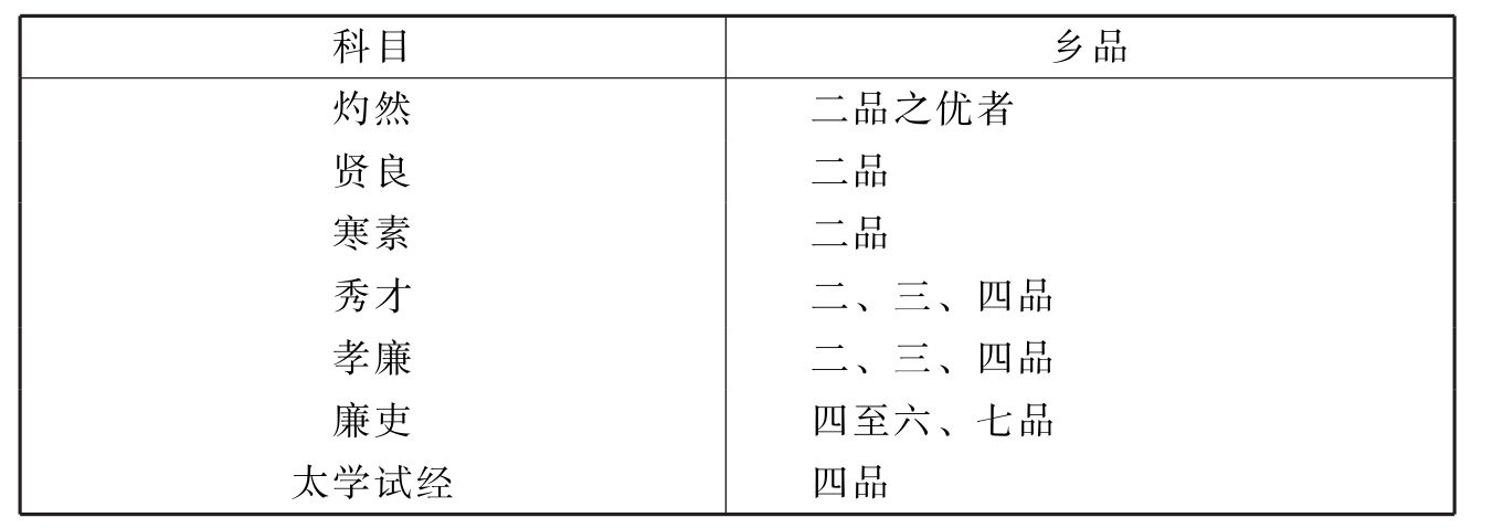 由此可见,虽然通过察举,一部分普通士人有了提高自己乡品的较多可能,但特别是在最为主要的秀孝岁科之中,仍有相当一部分人不能得到上品二品,而只能屈居三品或四品,尽管形式上他们仍被称为“一州俊选”、“古之名贡”。孝廉所得之乡品,从实例来看其平均水平又较秀才为低。而权贵子弟由之起家的“清途”诸官,一般均以乡品二品为资格;他们凭父祖爵位门第便可以轻取高品优状,步入“清途”。即就“散郎”而言,权贵子弟凭赐官就可以得到,而秀孝却须经州郡“试职”、中央策试之后方能获得。就此而言,察举制在此期已不如汉代那样,是士人之入仕荣途了。在九品官人法的制约之下,察举已被置于低于“清途”的地位之上。
