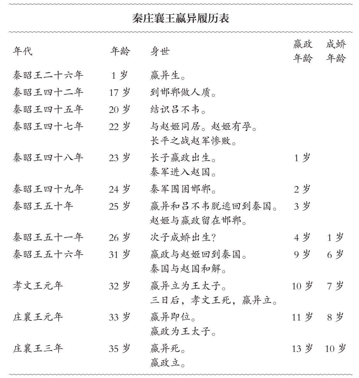 为了便于考察这件事情,下面,我将嬴异一生的情况整理成一份比较详细的年表,提供给大家。同时,为了便于考察嬴异与两位儿子间的关系,我在这份材料的旁边,注上了嬴政和成蟜的年龄。