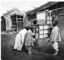 清末城市街头的拉洋片。拉洋片又称“西洋景”,其实无论和“西洋”还是“东洋”都毫无干系。在中国,冒名的东西多了。
