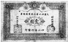 大汉四川军政府军用银票1元。从钞票上方,可以看到新的大汉国旗,中间一个“汉”字,十八颗黑星缀成一个圆环。