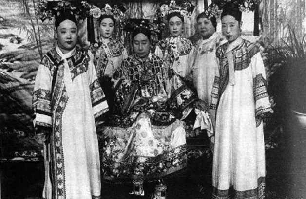 慈禧和光绪皇帝的后妃们,右一为隆裕皇后,左一为瑾妃