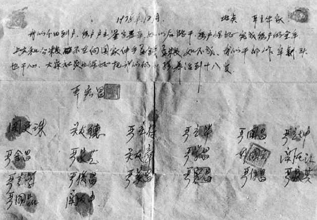 1978年11月24日夜,安徽凤阳县梨园公社小岗生产队队长严宏昌家,全队20户中在家的18位户主668签订了生死契约: