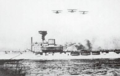 8月14日,外国记者拍摄的一张照片,三架中国霍克III战斗轰炸机正在飞向日军阵地,下方是正在撤离战区的英国竞技神号航空母舰。