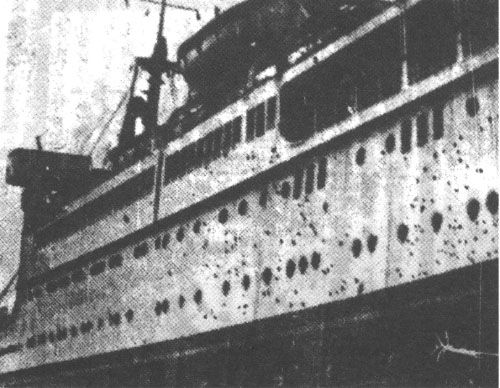 遭到中国空军袭击的日军运输舰。舰体上的黑色斑点,就是中国空军战机扫射的结果。