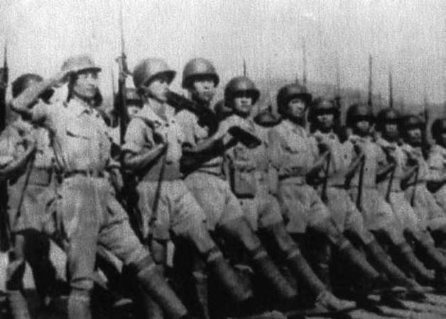 中美两国将领检阅远征军部队,右侧的美国将领是史迪威,左侧的两名中国将领是孙立人和罗卓英。