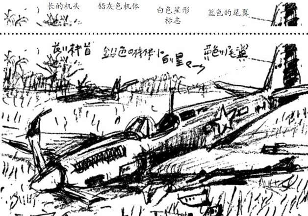 井上咸所绘孟关战斗被击落的美军P-51野马战斗机(虚线以上为译文)
