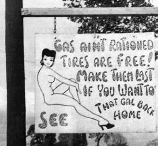 这也是远征军中的黄镜头之一——赤裸裸的加油站标牌:假如你想见到你家乡的女孩,就加满油(汽油不是配给的,要加多少有多少),换好轮胎,好用得久些。