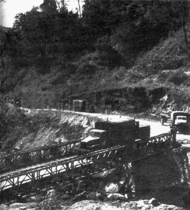 远征军官兵乘车通过简易公路桥开往前线——这种叫做贝雷桥的东西可能是英国人少见的优秀发明