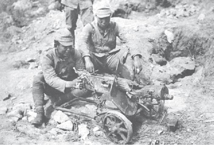 第十九师团在张鼓峰初战告捷,图中两名日军士兵正在摆弄已经被打烂了的苏军重机枪。