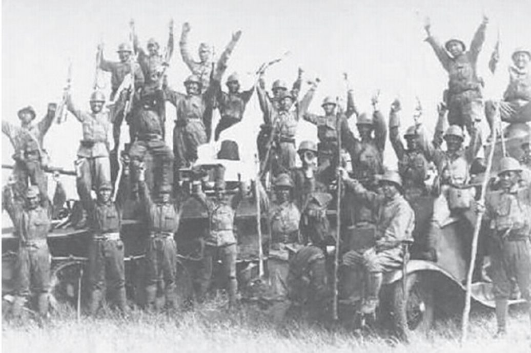 原题大意为“八百雄兵击败苏军坦克集群反扑”。看这些人欢呼雀跃的样,仿佛不是苏军坦克差点淹没了他们,而是他们已经把苏军坦克给干得一个不剩了。