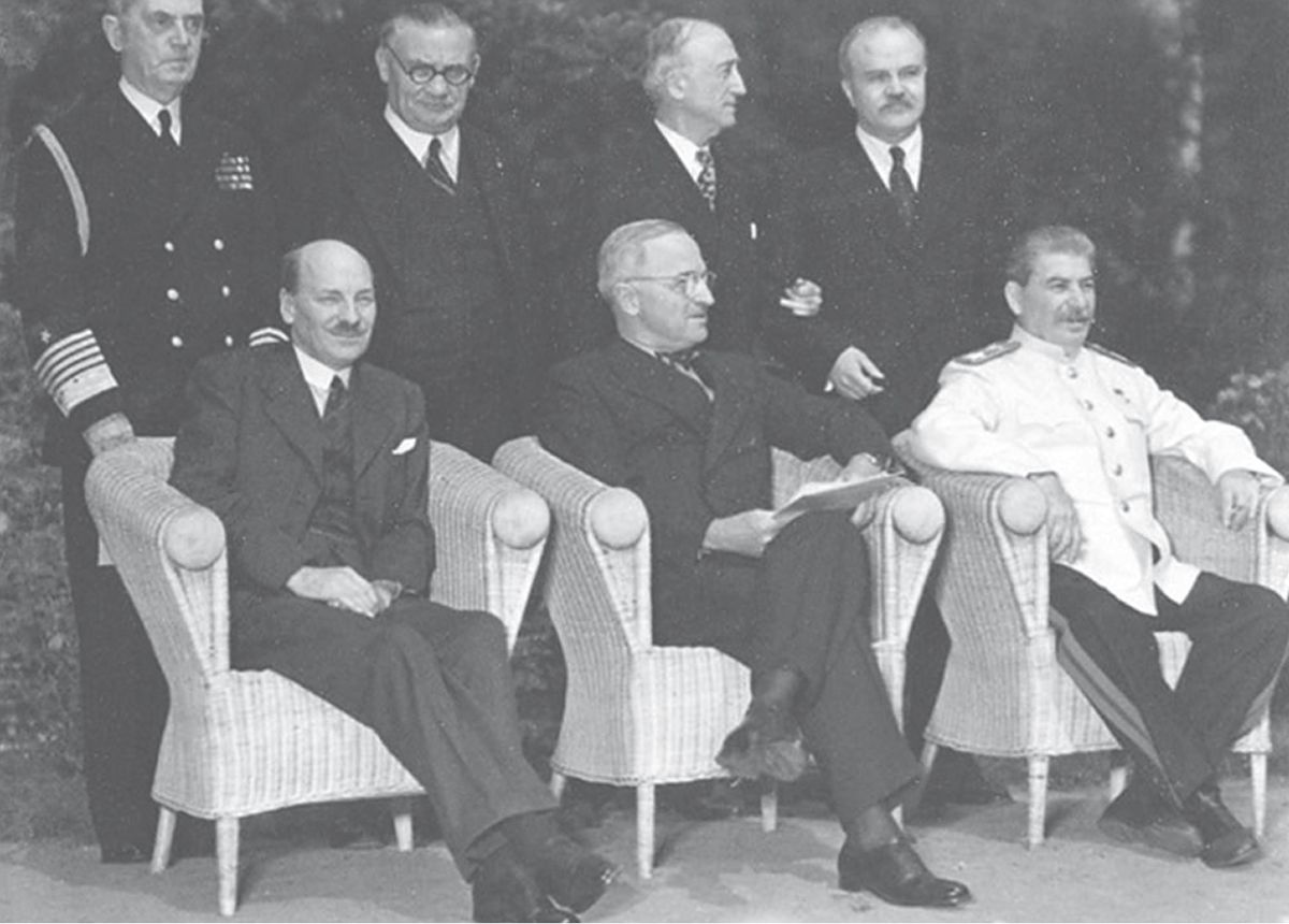 出席波茨坦会议的三国首脑,自左至右,分别为英国首相艾德礼、美国总统杜鲁门和苏联人民委员会主席(也称“苏联总理”)斯大林。