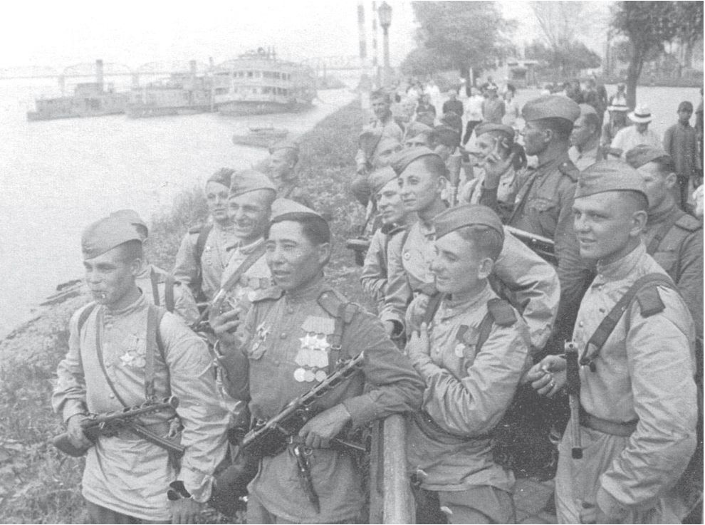 一群苏联士兵站在松花江边的哈尔滨银行前庆祝胜利,左胸上佩戴的勋章展示着他们在远东战役中所获得的军功。
