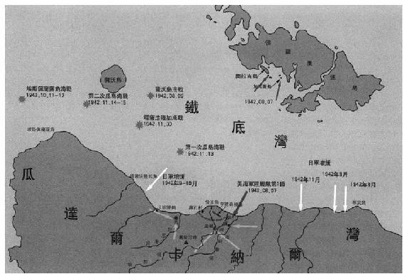 瓜岛战役形势图。繁体标注“瓜达尔卡纳尔湾”的所在,就是世界地图上只有针眼儿大小的瓜岛。范德格里夫特和他的部队即将在这座岛上经历冒险