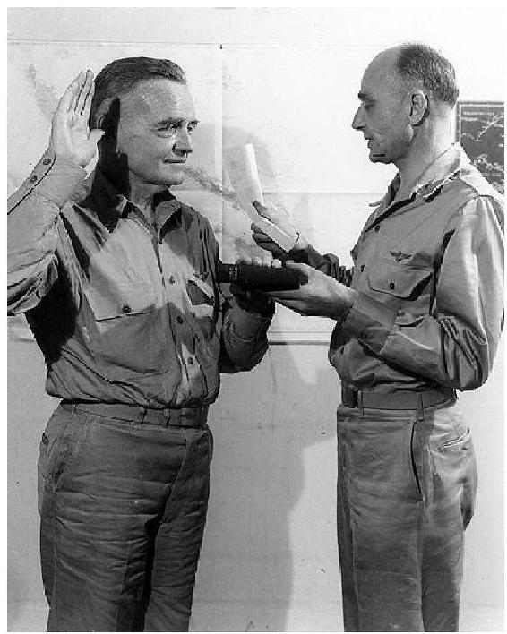宣誓就任南太平洋舰队指挥官时的哈尔西(左)。哈尔西极受海军和陆战队官兵的拥戴,他的到来使此前低落的士气得到振奋