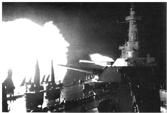 “华盛顿”号向“雾岛”号开火时的情景,由于目标很近,主炮仰角近乎平直