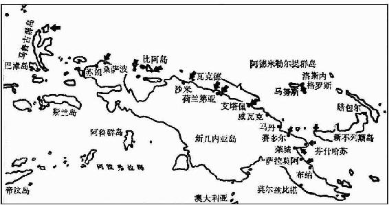 新几内亚战役形势图。因为这是一幅老地图,所以有些地名与现在的译法有所不同。例如腊包尔现一般译作拉包尔,威瓦克现译作韦瓦克,荷兰第亚则是老地名,今已改名为查雅普拉