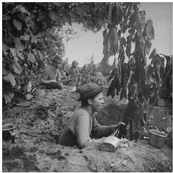 处于一个战壕中的盟军。照片中稍远一点儿是美军,近处是澳军,在环境恶劣的丛林战中,澳军更愿意戴头上这种轻便舒适的宽边软帽