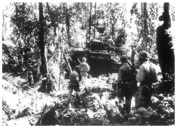 M3坦克在协助步兵进攻。M3系M2A4坦克的升级版,增加了装甲厚度,但仍属轻战车,也称“斯图亚特”轻型坦克。主武器为一门37毫米火炮,辅助武器为五挺7.62毫米机枪