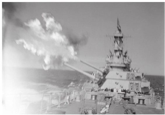 美军巡洋舰的主炮塔向冲绳岛上的日军阵地猛烈开火,火炮引起的震动使得镜头画面都出现了一定程度的模糊